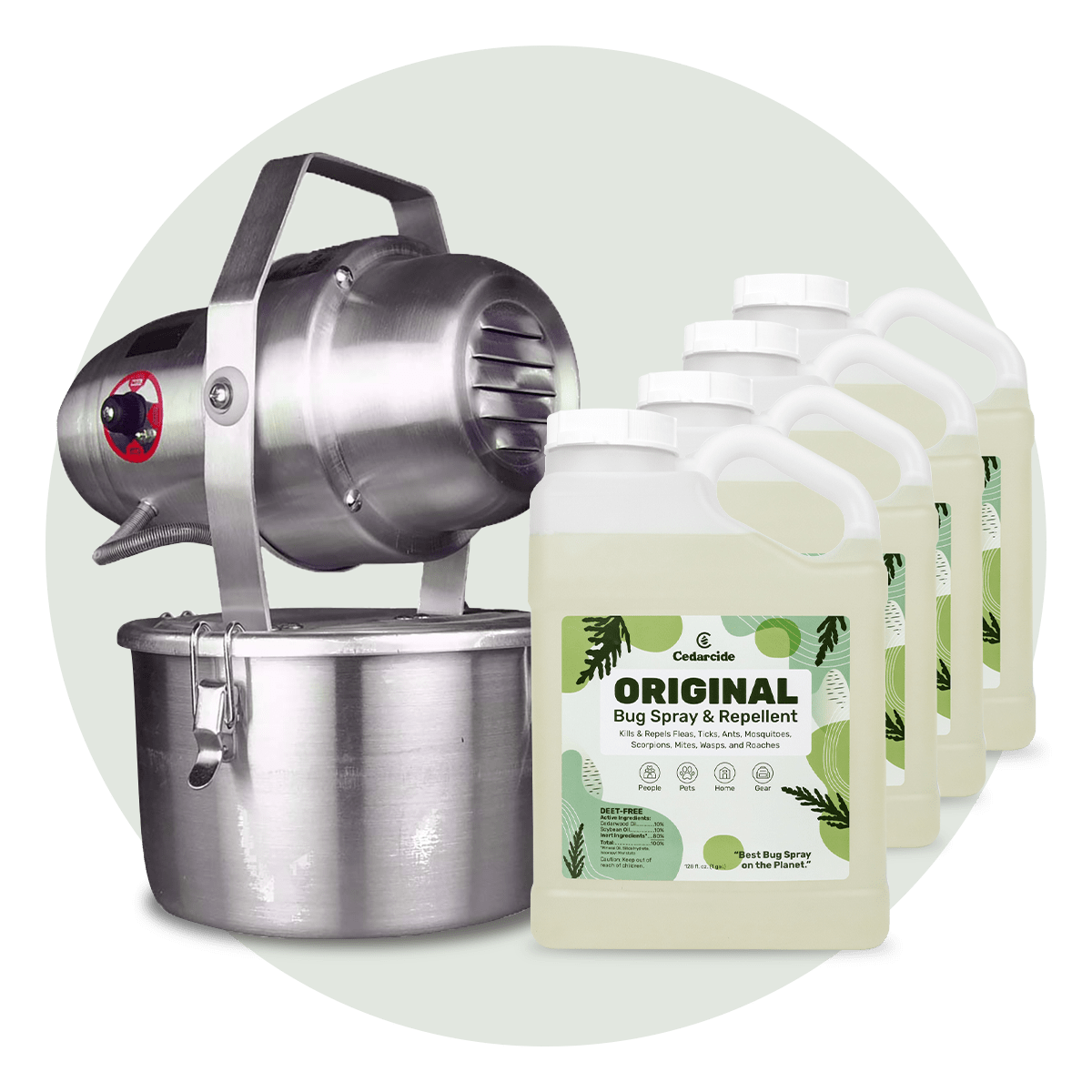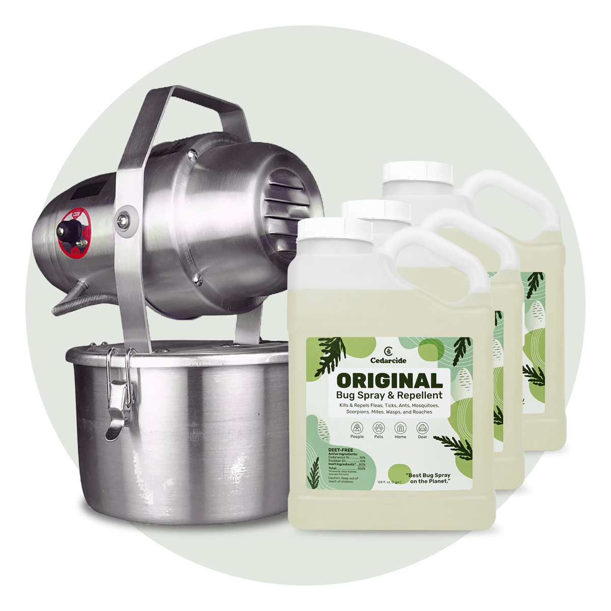 Our Fogging Kit with Cedarcide Original is powered by cedarwood oil, a naturally occurring pesticide that’s known to control a wide range of unwanted bugs. Original is third-party tested for fleas, ticks, mosquitoes, ants, mites, chiggers, roaches, wasps, and scorpions. However, our products have been popular for a larger range of pests for over 20 years.